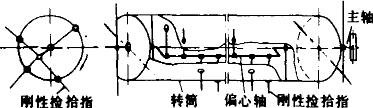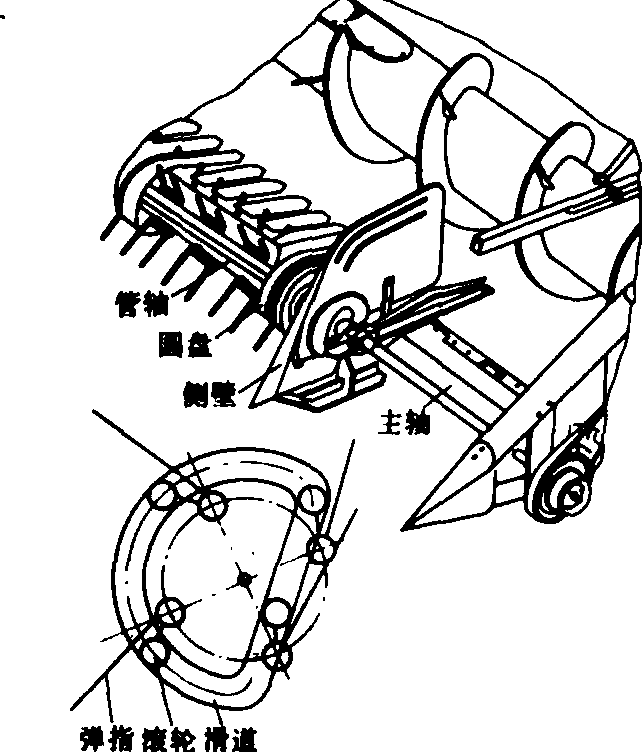 图1 刚性指转筒式捡拾装置 弹性指转筒式捡拾装置 结构如图2。主轴和圆盘固定在一起,当主轴带动圆盘旋转时,穿过圆盘的管轴也绕主轴转动。管轴上刚性地固定有若干组弹指。管轴端部和曲柄一端焊接,曲柄另一端装有滚轮,滚轮在侧壁上的半月形滑道内滚动。当弹指随管轴转到前下方时,弹指伸出,将禾铺挑起。随着主轴的转动,将禾铺向后输送。当管轴转到后上方时,滑道由圆形段突变为直线,靠滚轮和曲柄的作用,管轴继续绕主轴旋转,同时也绕自己轴线转一角度。弹指迅速回缩,脱离禾铺,避免造成缠绕。这种捡拾装置的主轴转速大多为60~90转/分,可固定不变,也可无级调节。弹性指转筒式捡拾装置适于捡拾各种麦类作物。