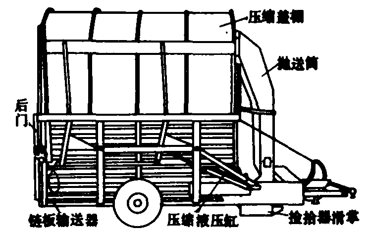 压缩式捡拾集垛机由叶片抛送式捡拾器、集垛车厢、压缩机构和卸垛装置等组成(图)。叶片抛送式捡拾器位于集垛机车箱前面,是作高速回转的若干排销连叶片,下带滑掌,可贴地滑行。集垛车厢支撑在行走轮上,上部有可上下移动的压缩盖棚,后部有平时锁住的上、下销连后门。压缩机构由位于车厢两侧的杆件和液压缸组成。卸垛装置是安装在集垛车厢底部的链板输送器。工作时,捡拾器捡拾草条,将其抛送到集垛车厢。工作中调节抛送筒出口处的活门开启程度,可使饲草均匀装满车厢。在装料过程中,定期利用压缩机构带动压缩盖棚向下移动,对干草进行压缩,在整个集垛过程中,一般压缩3~4次,压力为8 000~11 000帕,压缩草捆重量为600~1100千克。卸垛时,可先将集垛机牵引到卸垛地点,打开上、下后门,同时结合链板输送器,将车厢中的集垛向后部推送,当草垛开始接触地面时,向前开动拖拉机,前进速度和链板输送器向后的速度相同,以免破坏草垛的形状。当草垛完全被推至地面后,关闭后门,同时切离链板输送器的动力,恢复集垛工作状态。压缩式捡拾集垛机形成的草垛紧密平整,能很好地保持牧草质量,除牧草外还能用于各种矮秆作物茎秆,所以应用较广。
