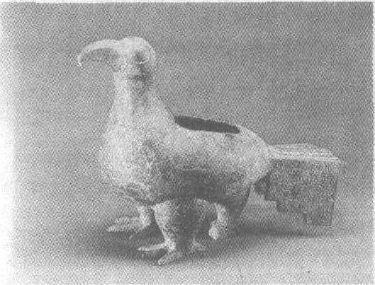 西周。高23.7厘米,长32厘米,腹深10.6厘米。重3公斤。1974年至1975年陕西省宝鸡茹家庄出土。宝鸡市博物馆藏。古代盛酒器。此尊作鸟形,足粗壮,尾宽垂,昂首钩喙。后端下有第三足作为支柱。背开方口。躯体及尾部均饰羽纹。同墓所出土的三足鸟共四件。古代传说日中有三只鸟,或与此有关。