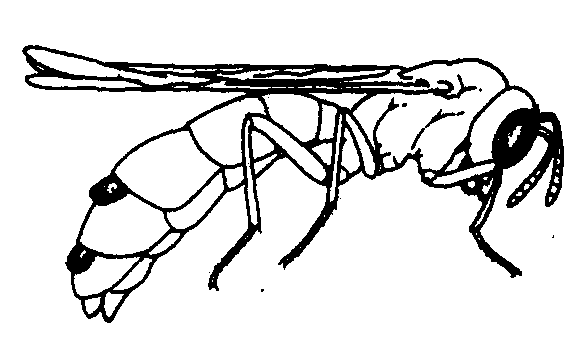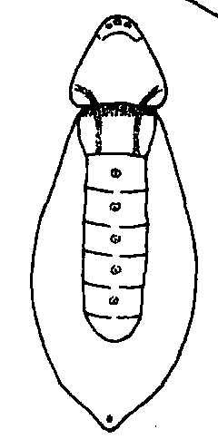 雌虫(图b)一般呈蛆形,除极少数种有足,可自由活动外,绝大多数均无足无翅,终生营内寄生。自由生活型的体长2.0毫米左右; 内寄生型的20~30毫米。头小,前口式,常与胸部愈合。触角、单眼及复眼消失,口器退化,具上颚。后胸具一对气门,少数种类中胸亦有一对。胸部腹面在头与胸的分界处有一育腔(brood canal)的开口,为雌虫受精及幼虫的逸出口。腹部发达,膜质,不分节,袋状,腹部腹面2~6节,有生殖孔(2~5个),通向腹部与外面包着蛹皮之间的空腔,即育腔。无外生殖器。