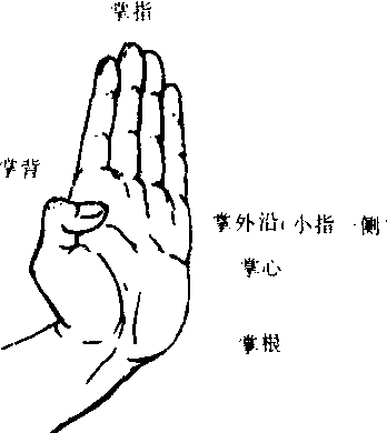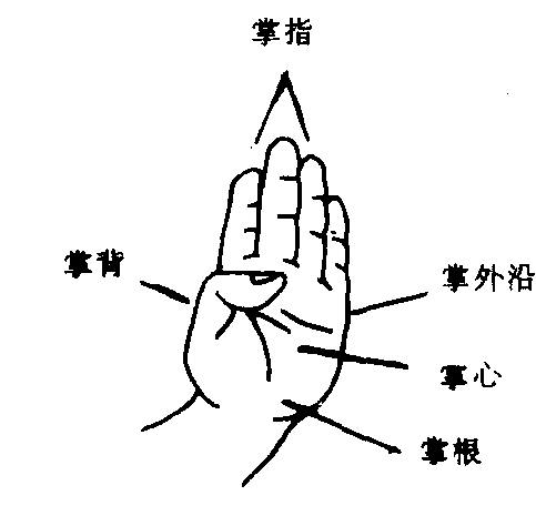 掌Zhang手型之一。为四指并拢伸直, 拇指变屈紧扣于虎口处的姿势。掌和掌的各部位名称见图。