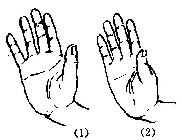 教学重点 强调四指以指根为轴尽量后伸。 掌太极拳手型之一。掌是各氏太极拳最主要的手型。动作规格:五指微屈分开,掌心微含,虎口成弧形(图2—4—19—