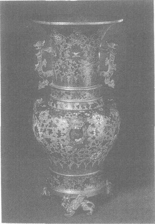 | 释义 | 掐丝珐琅三环尊元末。高70.6厘米,口径36.2厘米,底径23.1厘米。北京故宫博物院藏。尊为铜胎镀金,鼓腹长颈,大撇口;颈出夔凤双耳,肩部凸出三兽首口衔环,底承铜镀金飞兽三足。尊通身施浅蓝釉为地,掐丝填彩釉为纹,计有红、黄、白、紫、浅蓝、浅绿、墨绿等七色,构成勾莲、枝叶、花卉纹。颈下部和足上部分别饰葡萄和蕉叶各一周。口下沿与肩部饰重云一周,内填紫地花卉纹。在圈足的中心錾出镀金双龙,环抱阳文“大明景泰年制”楷书款。此尊下部原是一罐,其珐琅釉色与伊斯坦布尔珐琅颇似,当为元末制品。至清代初期,罐上加颈、足及三兽衔环,成为现在的尊,并錾款。但丝工、金色,尤其是釉色与元代工艺有明显的不同。