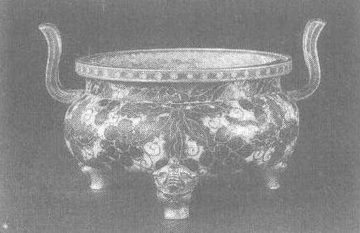 明中期。高10.1厘米,口径12.2厘米,足距9厘米。北京故宫博物院藏。炉为铜胎镀金。圆形,盘口,阔腹细颈。肩出双朝冠耳,底饰三象首足。炉通体以白釉为地,饰三簇浅蓝叶、紫葡葡,由肩垂下。收腹为平底,饰缠枝梅,菊纹。此炉为御用监制造。口、耳及象首足为清中期后配。
