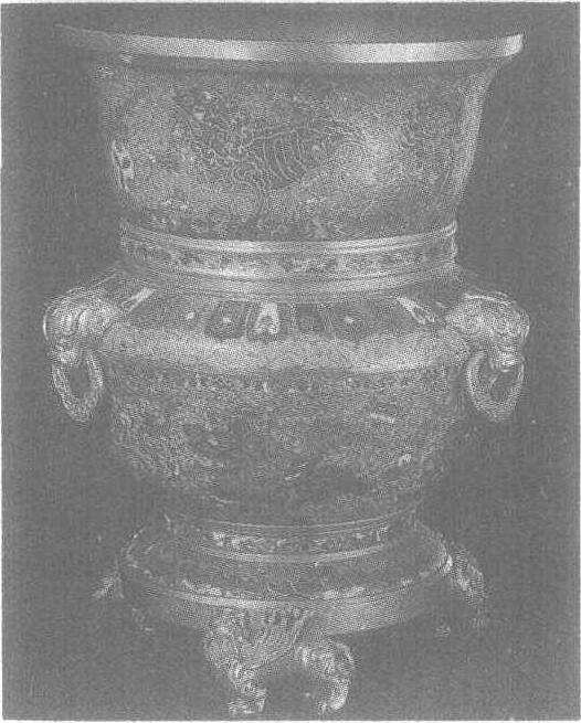 | 释义 | 掐丝珐琅狮纹尊明中期。高28.7厘米,口径21.4厘米,足径15.6厘米。北京故宫博物院藏。尊为铜胎镀金。圆形,鼓腹长颈,口微撇,大圈足。肩部凸起三兽首衔环,底设三只镀金铜飞狮为足。通身以浅蓝釉为地,腹部饰四狮戏球,间饰杂宝纹。肩饰莲瓣一周。颈部纹饰与腹部相同。足内中心刻起地阳文“景泰年制”楷书𣢾。此尊口、腹本是两个狮纹碗,其余部分均为后配,款亦为配制时刻制。
