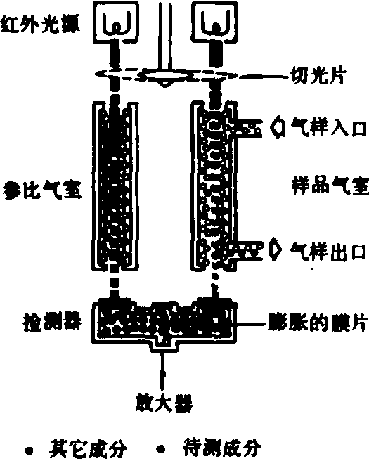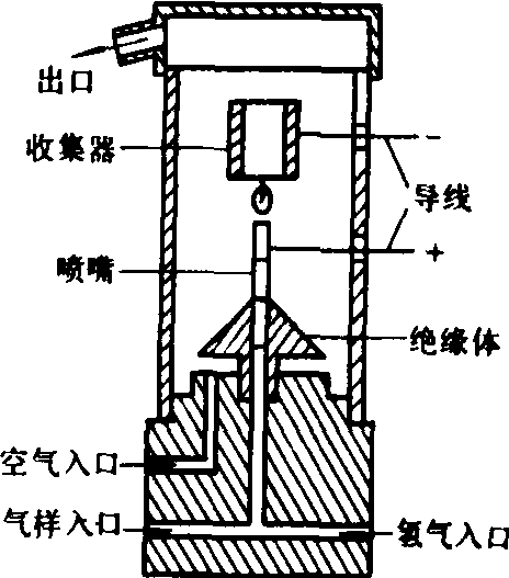 图1 不分光红外线分析仪原理示意图 氢火焰离子化分析仪(FID) 利用碳氢在氢火焰中产生微电流连续测定总碳氢的仪器。其感知元件氢火焰离子化检测器是一种氢火焰燃烧器(图2)。燃料气(氢气或氢气与惰性稀释气的混合气)和清洁空气连续通入燃烧器,由电热塞点火燃烧产生约2000℃的氢火焰。当含有碳氢的气样以恒定流量通过喷嘴进入燃烧器时,碳氢分子在高温火焰中电离成电子和碳的正离子。它们在静电场的作用下形成微电子流。其电流大小与气样中碳氢化合物以碳原子数计算的浓度成正比。因此,微电流经放大器后输出信号代表了气样中以碳数计的总碳氢浓度(ppmC)表示。取样装置需加热到一定高温,以防止气样中水分的凝结及高沸点碳氢的凝聚和被吸附。