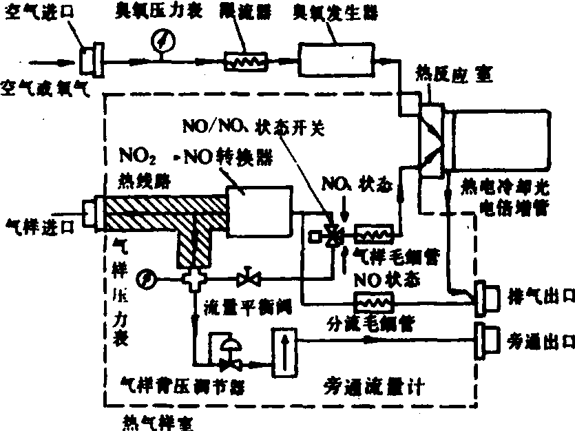 图2 氢火焰离子化检测器原理示意图 化学发光分析仪(CLD) 利用化学发光现象连续测定氮氧化物或一氧化氮的仪器。主要由臭氧发生器、NO2—NO转换器、化学发光反应室、光电倍增管以及仪表构成。连续通入臭氧发生器的空气或氧气在紫外光的辐射作用下产生臭氧。气样中的NO和臭氧在化学发光反应室中产生激发态的二氧化氮。当激发态回复到基态的同时,在近红外区发射光子,并在光电倍增管的作用下产生光电流。光电流经放大输出的信号大小和气样中的NO浓度成正比。仪器中备有NO/NOx状态开关,可以选择测定NO或NOx浓度。当气样通过转换器,使其中NO2转换为NO后进入发光反应室,输出信号代表气样中NO和NO2之和即NOx的浓度。当气样由旁通直接通入反应室,则输出信号仅代表NO的浓度(图3)。