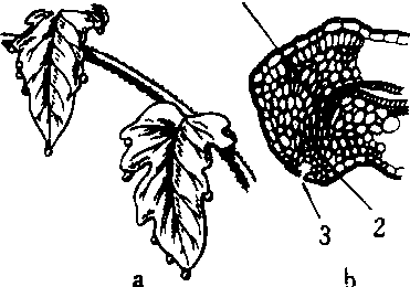 番茄叶上的排水器 a.番茄叶缘的吐水现象 b.叶缘排水器切面观 1.导管末端 2.通水组织 3.水孔 |