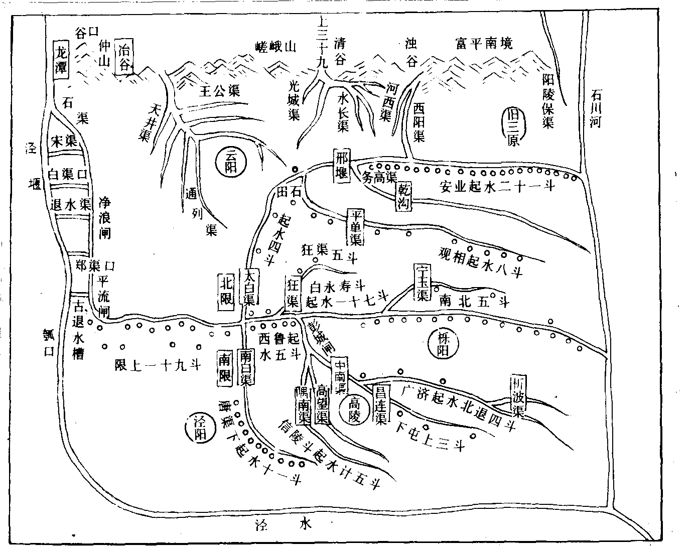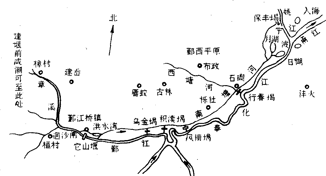 图1 它山堰 工程技术 引水排灌渠系由渠首和渠道两部分组成。 渠首部分 渠首工程,大致分为有坝引水与无坝引水两种。有坝引水工程,据记载最早的是公元前453年修建的“遏晋水”的智伯渠坝。之后建成的漳水渠,在20里长的漳水上建12座“墱”,即形成多级低滚水坝。因漳水落差大,多级筑坝,可避免筑高坝,技术上易掌握。而且漳水含泥沙量大,引水口易淤,多口引水,水量可得到保证。西汉时索勤在新疆楼兰“横断注滨河”,也是筑坝引水。按筑坝材料分,又有土坝、草土坝、竹(木)笼石坝、堆石坝、砌石坝等。土坝、草土坝易被水冲毁,常用来筑临时坝,一般引水工程都筑成石坝。曹魏建的戾陵堰“积石笼以为主遏”,是木笼石坝。汉中山河堰筑成桩基堆石坝。唐代宁波它山堰是砌石堰,条石之间用铁汁灌锢。元代引沁广济渠于沁河上建砌石壅水坝,石堰长100余步。关中郑白渠唐代时在泾河上建拦河坝“石”,是砌石坝,宋初石毁坏,重建的是木桩梢穰坝,元代改建成石笼坝,称为石囷堰。无坝引水工程,宁夏引黄灌区古代都是无坝引水,为了改善引水条件,清代在黄河中用石囤桩柴建迎水𡍹(导流坝)。如康熙四十七年(1708)建的唐渠口迎水𡍹,长450丈,宽约2.6丈余。四川都江堰在岷江中建的分水鱼嘴,也属于导流坝性质。 古代一些引水渠首,进水、溢洪、排沙等设施安排得很合理。如都江堰渠首位于岷江干流的冲积扇顶点,能自流浇灌广大的成都平原。其渠首工程布置巧妙,主要有分水鱼嘴、宝瓶口、飞沙堰三部分组成。鱼嘴的作用是分水,把岷江分成内外二江,起一定的调节内外江分流比的作用;宝瓶口系开凿离堆而成,是为坚固的石质口门;飞沙堰在溢洪时挟带大量的沙卵石一起排走。关中引泾渠道宋代叫丰利渠,渠首段设置前后两重闸门,以便更好地防洪防沙,两闸的北面各穿凿一个涵洞,两闸前渠道两岸都开有切口,进入渠口的涨水从切口分别排入涵洞和泾河(见图2)。宁夏灌区的渠道,一般建进水正闸 一座,正闸之上,建几座退水闸,以减暴水进渠。宁波它山堰宋代时为了防止泥沙淤塞渠道,在堰上游150米处建了一座3孔排沙闸。明清时豫北引沁渠道,如甘霖、广济、永利、利丰渠渠首都开凿成隧洞式,隧洞中建有闸室,广惠渠
