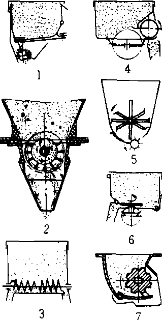 排肥器 1.振动式 2.摆抖式 3.搅龙式 4.转盘式5.搅刀拨轮式 6.星轮式 7.槽轮式 |