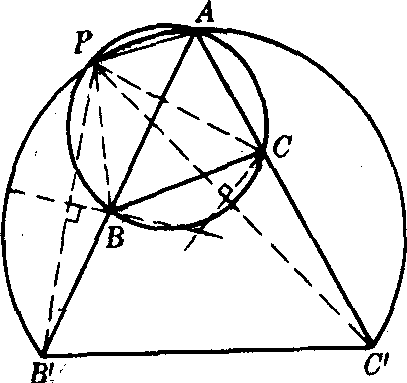 B′=l.同时⊙ABC也趋近于极限位置——通过A,B′两点又切AC于A,因而P点趋近于B′.又因为P点不能到∠BAC的内部,所以P必于B′处停歇,即B′是临界点.同理,在射线AC上取AC′=l,C′点也是临界点.由此推测,P点的轨迹可能是以B′,C′为端点而通过A的一段圆弧