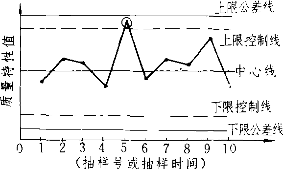 | 释义 | 控制图法quality control chart又称管理图法。根据数理统计原理,运用控制图来分析和判断生产过程是否处于稳定状态的一种质量管理方法。通常用于工序质量控制和分析,确定对设备、工装等的调整规律和改进检验方式。控制图的基本形式如图。在生产过程中,隔一定时间或生产一定数量产品以后,抽检一件产品,测量其质量特性值,将测得数据用点子描在图上。如果点子落在上、下控制界限之间,则表明生产过程正常;如果某数据点越过控制界限,则可认为生产过程发生了异常变化,需及时查明原因,采取措施以防废品产生。控制图可分为两类: