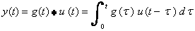 过渡(暂态)响应和稳态响应 输出y(t)一般是随时间而趋于零的和趋于常数(或某个函数)的两部分函数之和,前者称为过渡响应,后者称为稳态响应。在实际问题中,后者是我们预期的。一般希望过渡时间短,称为速应性。但不能过快,否则带来其他损害。因系统可能承受的输入随具体情况而异,其响应也各异,难于一一讨论。所以,实用中常讨论几种典型的简单输入函数作用下的响应。常用的U(t)函数有单位冲量函数σ(t)、单位阶跃函数l(t)和单位斜坡函数t。其中,σ(t)函数的响应称为单位冲量响应,记做g(t)。可以证明g(t)=L-1〔G(s)〕,所以它也被看作系统的模型。而且,传递函数为G(s)的系统对于任意输入u(t)的响应y (t)可由下式给出: