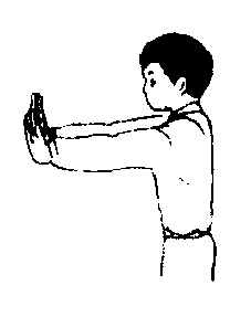 | 释义 | 推掌长拳手法之一。套路中主要有弓步推掌、马步侧推掌、歇步推掌等。其基本练习为:❶两脚左右开立,与肩同宽,两掌置于腰间,掌心向前上方,肘尖向后,挺胸、收腹、直腰,目视前方。