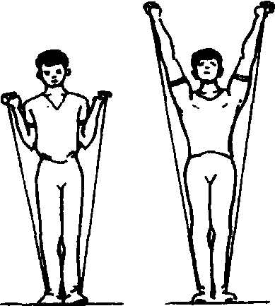 器材 橡皮条2—3根。 场地 操场空地进行。 游戏方法 把学生分成人数相等的2—3组,成纵队站好。预备时,各组第一名同学每人一根皮条,手握皮条两端,两手心向上,再将皮条中间踩在双脚下面。教师发出开始口令后,各队员迅速做上推动作,并计算次数。直做到推不起来为止。然后再交给本组第二名同学继续按上述方法做,依次进行。最后以积数最高的组为胜。 游戏规则 ❶上推时两臂必须伸直。 ❷要连续完成上推动作。 |