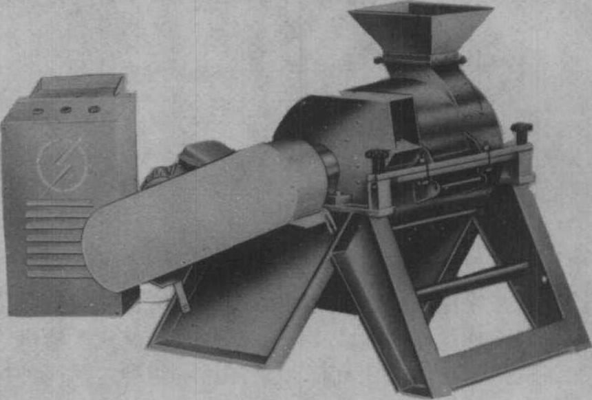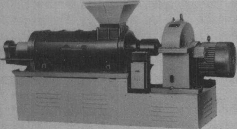 图1 翼形转子式揉切机 齿辊式揉切机 简称C.T.C (crushing, tea-ring,carling)。机器有两台联合机或3、4、5台联合的多种形式。按齿辊的长度分61、76、91厘米三种规格。齿辊由一对慢速辊和快速辊组成,速比为1:10,常用的为70:700; 80:800; 90:900转/分。齿辊揉切机一般与翼形转子机配合使用, 萎凋叶先经转子揉切机初揉后经齿辊揉切机的上叶输送带,匀叶器和磁铁,平铺成薄薄的一层, 送入两个齿辊之间, 出辊转向一正一反, 啮合间距由大到小, 最后一对间距为0.02毫米。它的工作原理是当茶叶进入两齿辊啮合间隙时,被一快一慢的齿辊挤压, 撕裂和捲曲成小颗粒状。茶叶经过齿辊不到一秒钟, 加上经输送带上的时间, 仅2~3分钟, 具有快速而强烈的揉切性能。生产上采用翼形转子机→C.T.C→C.T. C→C.T.C制法,制成的红碎茶具有浓、强、鲜的滋味和红艳明亮的汤色, 中国在广东、湖南、江苏等省已生产齿辊式揉切机。 锤击式揉切机 又称L.T.P或劳瑞制茶机(La-wrie tea processor)。20世纪70年代后期由英国伦敦久克茶机公司(Jokal Tea Holding Ltd.London)制造。中国1980年引进, 在广东英德茶场、湖南瓮江茶厂和广西百色茶场中使用。 机子构造分两部分; 筒体和转子。筒体内径56厘米, 内壁为不锈钢。转子转轴上装有160片活动锤片和锤刀, 每组4片, 成90°均布。活动锤片(刀)旋转角度约为120°。前8组和第24组为锤刀, 锤刀横断片呈梭形, 其余各组均为锤片, 锤片横断面呈矩形, 锤片厚10毫米, 锤片(刀)是中碳钢, 在尖端上是碳钨合金钢, 锤片(刀)与筒体间隙6毫米。该机用37千瓦的电动机带动, 转子转速2250转/分。 工作原理是锤刀、锤片高速旋转, 其尖端产生很大的动量, 将茶叶劈碎, 两端的两个风机也产生很大的风压, 将茶叶从进叶端吸入, 被锤片在几秒钟内击碎, 形成大小匀齐, 色泽鲜绿的粒状带片的碎茶喷出机外。此机直接加工萎凋叶, 达到了强烈快速揉切,有利于发酵, 较传统制法强度高, 每小时可加工萎凋叶1500千克。该机只能把萎凋叶打成碎片, 对叶细胞无撕裂作用, 须与齿辊揉切机配合使用, 才能取得良好品质。中国在湖南、四川等省制造出筒径30、40、50厘米三种规格的锤击机(图2), 中国农业科学院茶叶研究所在1982年试制6C Z-30型小型锤击机。