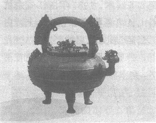 | 释义 | 提梁螭流兽盖铜盉战国。通高29厘米。1981年浙江省绍兴狮子山出土。浙江省博物馆藏。此盉扁圆体,通身饰三角形云纹和菱形纹。腹部铸有四道凸起弦纹。流为螭首形,螭嘴扁平,首顶上一环,并铸蟠螭四组。鋬为扉棱形。腹下三短蹄足,每足上端饰有12条蟠螭,外侧有一浮雕虎。有提梁,出土后残损。梁首为螭首状,背有扁形镂孔状的脊。梁下偏后有一小系环,可以链与盖相连。盖成盘式,盖顶中心有一钮。盖面铸立体螭龙11个,犀、象、虎、熊、鹿等各种兽类16个。此盉装饰纤巧,做工精细,系江南青铜器典型作风。