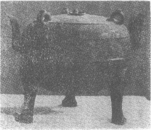 | 释义 | 提梁铜鼎战国。炊器。通高27.5厘米,口径24厘米,腹径27.5厘米。重6.6公斤。1979年河北省容城县晾马台出土。容城县文化馆藏。此铜鼎长方附耳,圜底鼓腹,蹄形三足。身有子口,腹饰凸弦纹一道,底饰带纹一周,带纹中间饰十字纹。盖肩部饰凸弦纹一周,上饰对角半环形钮三个,钮身中间凸起脊带,上饰重环纹,钮顶凸起乳钉,上饰涡纹。盖中间设有活环提梁一个,环身饰重环纹、云雷纹。鼎身烟炱严重,厚达0.2厘米。年代属春秋晚期、战国初期之物。1979年出土时,铜鼎内装有铜壶盖大小两个。大盖与“西宫”铜壶吻合,盖上铭文与壶口处铭文相同。小盖口沿处阴刻“左征”二字。