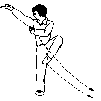 步型拳动作之五。为提膝与穿掌同时完成的基本动作。教学重点 强调:❶由歇步推掌变提膝穿掌时要以脚掌为轴,边转边穿。❷支撑腿要挺膝站直。❸右掌要挺手指。