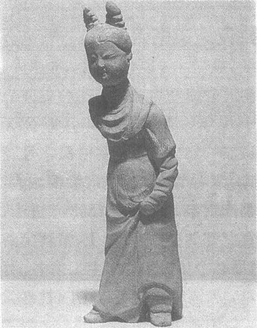 唐。高29.2厘米。湖北省武昌市钵盂山出土。湖北省博物馆藏。此俑为一少女形象,梳双丫髻,窄袖衣外罩半臂,裙长及脚面。其面庞丰满圆润,五官玲珑,面带童心未泯的灿烂笑容。身材匀称,腰微弯,左手提裙(右手残失),两腿分开作迈步前行状。塑造手法简练,艺术表现力强,是件十分可爱的陶塑作品。