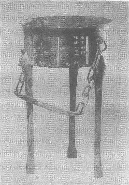 提链铜炉汉代铜器。1981年在陕西兴平县茂陵东侧最西边一座无名冢中发现。通高37.4厘米,外壁刻“阳信家铜炉, 容斗五升”。 |