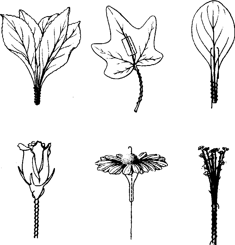 ❸作环加固。将铁丝弯成环形,托住花头(图1)。固定花材的主要方法:❶花泥固定。多用于大口浅盘式容器和花篮。花泥吸水后,按容器大小削成适宜形状,放入容器内。大型作品还应在花泥外包裹金属网罩,把花材基部斜切后插入花泥。