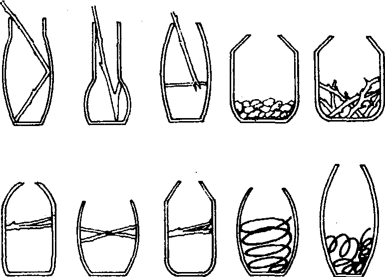 ❸细口高瓶容器固定。可用下述方法固定花材:折曲花枝,使其靠在瓶内壁,借助瓶壁支撑固定;用小段枝条作成“丁”字、“V”字、“十”字形架,卡在瓶内口以固定花材;把铁丝卷成团或短枝条交错后放入容器固定。此外还有将玻璃球、小卵石放入容器,将花材插入缝隙等固定方法(图2)。