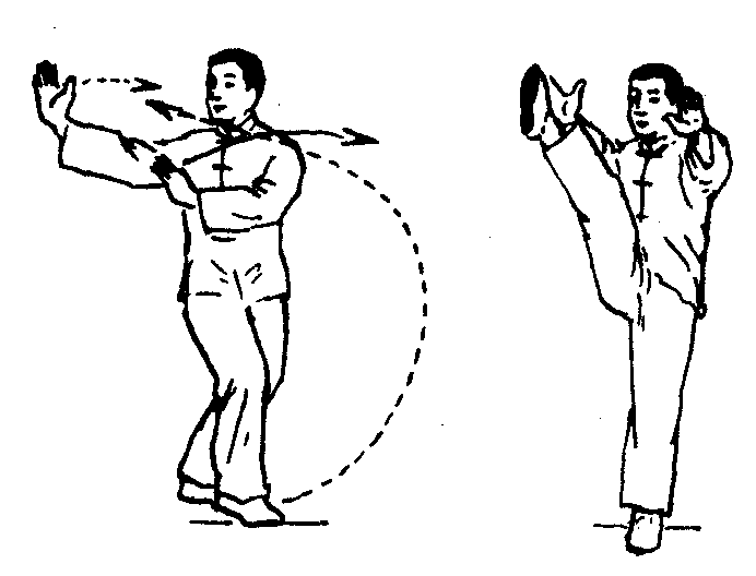 太极拳腿法之一。是一种弧形直摆击响性腿法。各式太极拳中都有摆莲脚动作。摆莲脚是太极拳七种主要腿法之一,在各种太极拳套路中是出现次数最多的腿法。动作过程:(以右摆莲脚为例)左腿微屈站稳。右腿从左侧摆起经面前向右做扇形摆动,两手在额前依次迎拍脚面。(图2—4—35)动作要领:做摆莲脚时要做到:❶以大腿带小腿,力达脚面。❷击拍时,脚面展开,腿自然伸直。❸击拍要准确、响亮(两响)。❹击拍高度为面额前方。攻防含义:摆莲脚是用腿、脚横击对方。其特点是攻击面大,力量重。注意事项:❶做摆莲脚时,上体稍前倾,不可左右摇摆。❷有时做摆莲脚伴随着身体转动,支撑腿要同时转动,并站稳。❸老年人做摆莲脚时,手可不用击拍脚面。用两手击拍大腿就可,摆动腿也可稍屈。