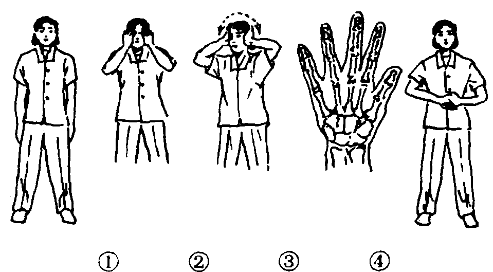 练功十八法第6套第1节。动作过程:两脚分立,与肩同宽。(图2—4—150—