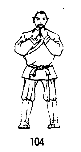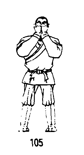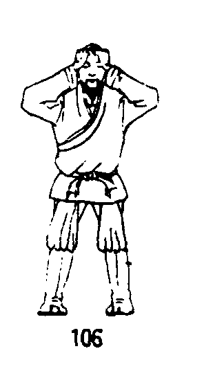 四十九式经络动功第3段“导气”动作之二(全套动作顺序第二十四式):❶随着吸气,提肛调裆;两掌从关元经天突上移至承浆穴,继而绕地仓、迎香、睛明至神庭将十指分开,用指尖从前发际梳到后发际。(图104、105、106)❷随着呼气,松腹松肛;两掌分别从后发际向前经面颊使中指端至承浆穴。(图107)练功次数:摩面梳头共做3次。要点:动作速度均匀,力量柔和;意在丹田,高血压患者可意守涌泉。
