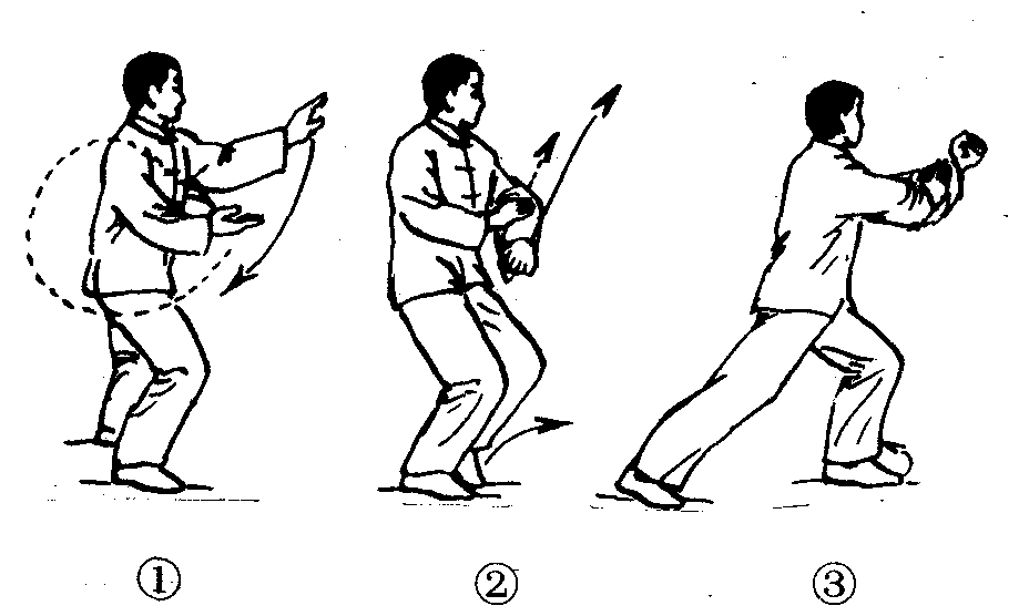 ❷回收时,两手交叉划圆,左掌边收边握拳,要做成捋的动作。