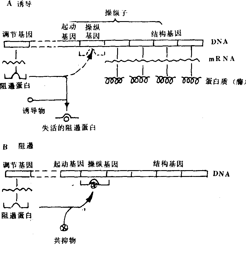 A.诱导:调节基因产生阻遏蛋白,后者阻遏操纵基因,从而使结构基因不能产生mRNA。当加入诱导物时,