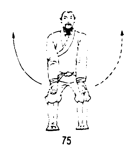 | 释义 | 擒捉伏兔四十九式经络动功第1段“通经”动作之七:随着呼气(聚呼),松腹松肛,脚跟迅速震地,两腿半蹲;同时两腕放松向前,向下弧形抽打膝上6寸起肉处的伏兔穴;眼平视前方。(图75)练功次数:叶底藏花和擒捉伏兔二式连在一起各做3次。要点:重心尽量高提;吸气时细匀深长,呼气时轻吐“呬”音;两掌抽打伏兔穴要富有弹性,快速而准确。下接动作之八——怀中抱月,动作之九——商商相接。