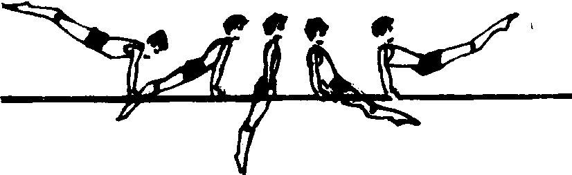 保护与帮助 保护者站在练习者杠侧位置,一手握其上臂,一手在前摆时托其腰背部,在后摆时托其腹部助其摆动。 教学重点 ❶支撑时,以肩为轴摆动,切勿前倾、后仰。 ❷摆动时,拉开肩角,脚尖始终沿最大弧线运动,切勿屈腿和抬头。 |