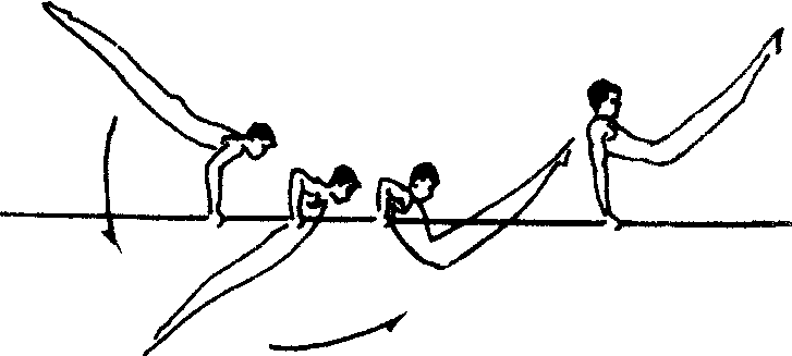 支撑摆动臂屈伸 支撑摆动臂屈伸在双杠上由支撑开始后摆,当身体后摆至水平位时做顶肩和伸双臂动作;随后做身体前摆下落和两肘弯屈动作;当身体摆过垂直部位时,两臂逐渐伸直,两腿向前上方摆起,直至肩角被拉开。也可由支撑前摆开始,到后摆时两肘弯屈,当身体摆过垂直部位时,两臂伸直,两腿向后上方摆起。 |