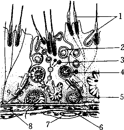 支柱细胞的形态与功能 1.精子 2.精子细胞 3.溶酶体 4. 精母细胞 5.精原细胞 6.内皮细胞 7.毛细血管腔 8.类肌细胞 9.血睾屏障 |