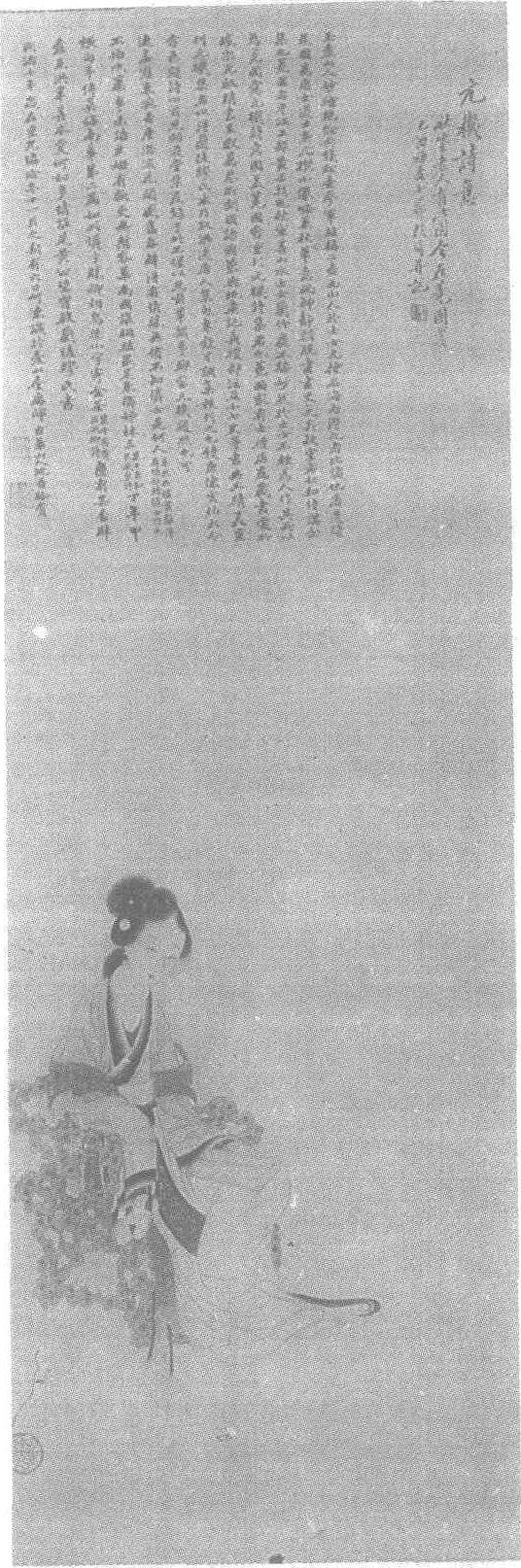 | 释义 | 改琦元机诗意图轴清。改琦绘。绢本设色。纵99厘米,横32厘米。北京故宫博物院藏。改琦(1773—1828年),字伯蕴,号香白,又号七芗,别号玉壶外史。其祖先西域(今新疆)人,久居松江(今属上海市)。幼聪敏,诗画天授,人物、佛像、仕女出入李公麟、唐寅、赵孟頫诸家,拙媚跌宕入古,笔姿秀逸,山水、兰竹本前人,世以新罗山人比之。师承前人而又能独具面目,是清代著名的人物画家。嘉庆二十一年(公元1816年)曾作《红楼梦图咏》,有名于时。有《玉壶山房词选》。此幅画的是唐代女诗人鱼玄机的像。鱼玄机,约生于844年,卒于871年,字幼微、蕙兰。清代时因避康熙玄烨之讳,改称鱼元机。她很有才华,喜欢读书、作诗,受到当时文人们的重视,温庭筠等名家就与她有诗的唱和。但她的遭遇却很不幸,嫁给李忆为妾,因受李妻的妒嫉,被迫出家,在长安咸宜观做了女道士。后因妒嫉笞杀侍婢绿翘,被判死刑。其时年仅20多岁。留有诗文一卷。画面分为二部分,立幅的左下方,元机坐在一张木椅上,左手持卷置于膝头,右手轻轻搭在扶手上。头盘方髻,娴静秀雅,凝神而思,神态自然。用笔简净,笔劲娟秀,线条流畅,设色淡雅和谐。月白色的上衣和白裙,镶以黑色高领。宝蓝色披肩饰带,头饰简朴素雅。上方的长题占去了一半的画面,没有任何背景,与清代人物画配景的方式截然不同,独具匠心。人物的神态、装束及背景的特殊处理,成功地刻画了一位才思聪慧,但命运多舛的青年妇女形象,流露了画家对她不幸身世的理解与同情。画幅上方除有画家本人自识外,还有古华山人沈吾的题跋,记述了画家作画的由来。此幅画于乙酉初夏,即道光五年(公元1825年)。改琦时年52岁。