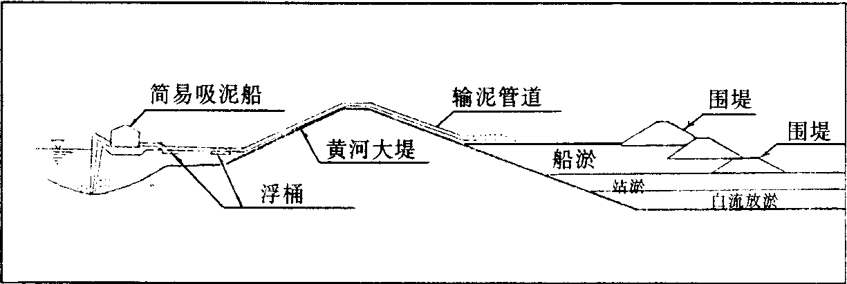 简易吸泥船放淤固堤示意图 放淤固堤的方式较多。自流淤灌是利用水位差,在堤身建引黄闸口,引水淤灌; 机具提灌是在靠河水比较稳定的地方建立扬水站、虹吸等工程,提水淤灌; 吸泥船淤灌是比较机动的受河势等自然环境影响较少的一种方式,在特制的船体上安装泥浆泵、高压水枪、柴油机等抽吸河水和河床泥沙。黄河上放淤固堤一般本着先自流淤灌,后机械提灌; 先淤险工地段,后淤平工地段的原则。放淤固堤还结合土壤改造,农田灌溉等当地农业生产进行。黄河下游堤防通过放淤,许多堤段背河淤宽30米~50米,淤高1米~5米。特别是险工堤段得到了加强,缩小了临背悬差,增强了堤身的稳定。 |