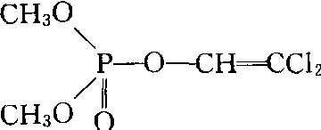 敌敌畏对昆虫具有胃毒、触杀和熏蒸作用,能抑制害虫神经系统的胆碱酯酶使其死亡,为广谱、速效杀虫剂。但残效期短,约为72h。对刺吸口器和咀嚼口器的害虫都有效,农业上用于防治粮、棉、油、菜、果等多种作物的害虫,也用于防治仓库害虫及卫生害虫。通常加工成50%或80%的乳油使用。将乳油稀释2000倍喷雾,可防治各种蚜虫、红蜘蛛、稻飞虱、粘虫、菜青虫、卷叶蛾以及臭虫、蚊子、苍蝇等卫生害虫。用纱布沾取500倍的稀释液,挂于室内,对蚊、蝇有良好的熏蒸效果。敌敌畏对人、畜毒性较大,使用时应注意防护,避免与皮肤接触。要妥善保管,防止误食。密闭熏蒸后,应注意通风。对高梁有药害,不宜使用。对瓜、豆类作物较敏感,使用时不宜低于500倍。不可与碱性药剂混用,以防失效。稀释后的药液,不能久存,以免分解降效。密封保存在阴凉处,以防挥发损效。 敌敌畏dichlorvos速效广谱性磷酸酯类杀虫杀螨剂。商品名DDVP 。化学结构式: