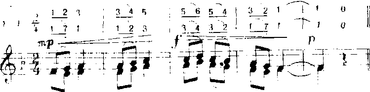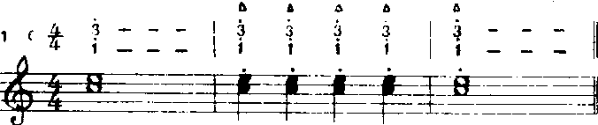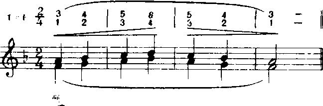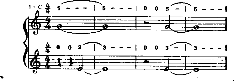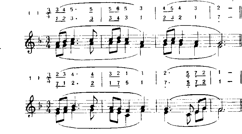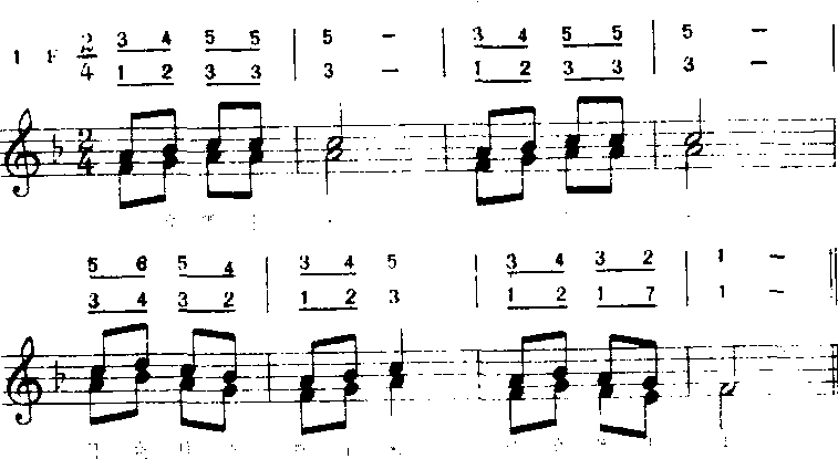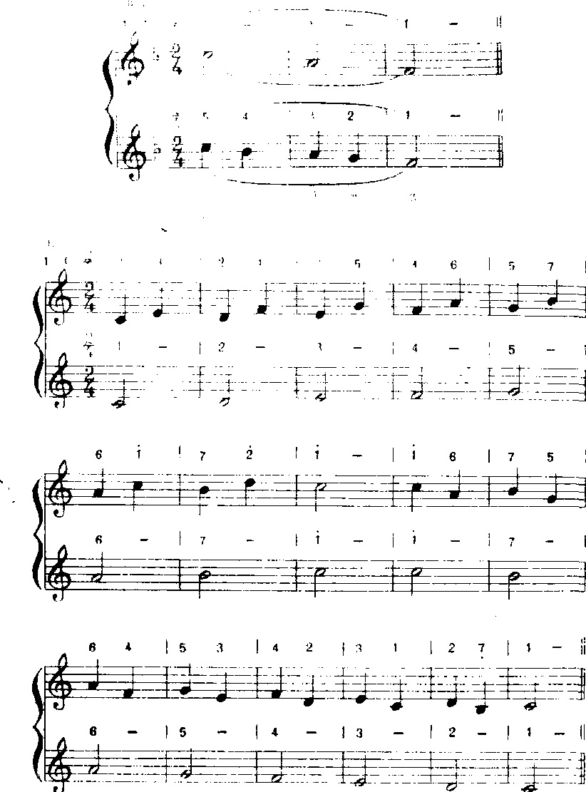 依照上述方法再依次进行四度、五度和六度音程的练习。训练时要严格要求音准。 保持一个声部为一声部唱过渡音的练习:如: