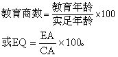 | 释义 | 教育商数educational quotient, EQ学生的教育年龄与实际年龄之比,表示教育程度的一种相对量数。其公式为:教育商数=(教育年龄/实足年龄)×100。若一个9岁儿童的教育年龄为10岁,则他的教育商数为10/9×100≈110。 教育商数教育年龄除以实足年龄所得的商。各种成就测验依据教育年龄建立常模时不一定在同一团体中取样,用不同的成就测验求得的教育商数也不同。常用的教育商数公式如下: 教育商数教育年龄除以实足年龄所得的商。各种成就测验依据教育年龄建立常模时不一定在同一团体中取样,用不同的成就测验求得的教育商教也不同。常用的教育商数公式如下: |