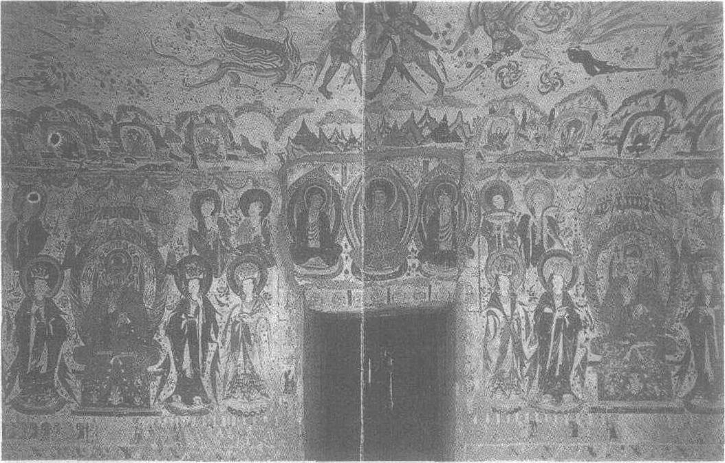 | 释义 | 敦煌285窟东壁说法图东壁壁画采取左右对称的布局。中间门上画三世佛一铺。门南北均画大型说法图,表现形式和人物衣着与北壁说法图相同。说法图中佛像着对襟大袍,垂裙重叠,结跏趺坐,作说法相。头上悬中原式双龙华盖垂旒苏羽葆,题名无量寿佛。左右胁侍菩萨四身,其中二身大冠高履、褒衣博带; 另二身半裸,披巾交于腹前,题名见有无尽意菩萨、大势至菩萨、文殊师利菩萨、观世音菩萨。其上弟子四身,持鲜花供养,题名见有阿难之像供养佛时、摩克迦叶之像、舍利弗之像、目连之像。人物身材修长,脸型清瘦,属于秀骨清像风格。两侧都画供养人行列,北侧为男供养人; 南侧为女供养人。女供养人头顶饰鬟髻,鬓发长垂。身穿大袖襦、间色裙。这是北魏孝文帝改制后鲜卑妇女的时装。壁画最下部,在忍冬纹边饰之下,有重层壁画,表层为五代画男供养人像,底层露出底层壁画药叉形象。