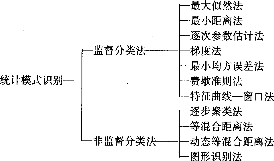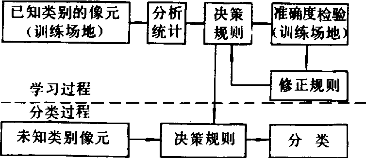 监督分类法 根据人事先指定的已知训练场地提供的样本,通过选择光谱特征参数、建立判别函数来对未知类别的像元进行分类处理。计算机对训练场地内的已知像元的光谱特征进行分析统计,提炼出这些类别的光谱特征参数或建立相应的判别函数,作为区分其余未知类别的像元的依据。利用训练场地的已知像元训练计算机或估计参数,从而形成判别函数的过程,是监督分类的学习过程;利用判别函数对未知类别的像元进行识别分类的过程,称为监督分类的识别分类过程。这两个过程的关系见图1。由于提供的训练场地所包含的已知像元总是少量的,未知像元总是大量的,故要求已知像元具有代表性,以保证分类结果具有足够的精度。