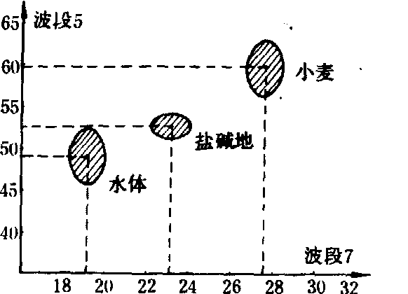 式(1)~(3)中,mi为第i个训练场地内已知像元的个数;Xij是第i个训练场地内已知像元j的光谱信息,共有n个分量,即x1、x2……xn;n是分类处理所用的谱段数;Mi及∑i表明在n个谱段的光谱信息构成的n维特征空间中,类别i的光谱分布区域的重心位置、大小和形状,反映出该类别的已知像元的光谱统计特征。图2给出小麦、水体、盐碱地在由陆地卫星5、7两个谱段构成的二维空间中的光谱特征椭圆体。椭圆体越小,该类像元的光谱取值范围越集中,反之越离散。根据公式