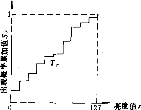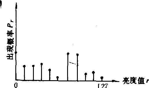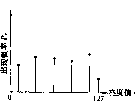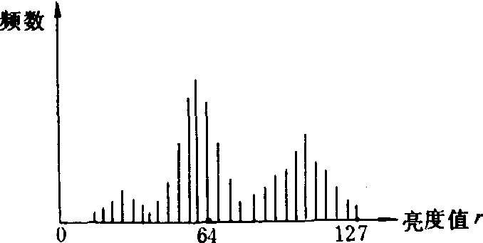 图1 直方图 直方图均衡化。首先利用指定的变换函数T(r)把原图像的直方图修改为均衡直方图,然后按照均衡直方图调整各像元的亮度值,扩大原图像的像元亮度值r的分布范围,改善其对比度。图2是一幅原始图像的直方图,图3是指定的变换函数,图4是均衡化处理后的直方图。经过这种处理,原始图像中亮度值最集中的范围得到最大的反差增强,即中间范围的亮度值优先被伸展,它们所代表的地物获得最大的反差而最易于识别,原始图像中极亮和极暗的部分则被严重压缩而不易识别。直方图规定化。用指定的指数函数、对数函数、线性扩展函数或分段线性扩展函数等作为变换函数,把图像的原始直方图调整为事先规定的形式,然后按照该形式的直方图调整原图像,压缩不需要的部分而突出需要的部分,从而达到增强图像的目的。其中,用指数函数作为变换函数时能压缩图像中低亮度层次的像元,增强高度层次的像元;对数指数则扩展低亮度层次部分而使得高层次被限制在一定的亮度层次内;线性扩展函数均匀地增强所有的亮度层次;分段线性扩展函数则区分不同的情况,根据赋予的不相同的比例因子对各亮度层次予以不同程度的增强。