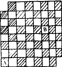 国际象棋中马的走法与中国象棋基本相同, 差别只在于国际象棋的棋子是在格子里, 而中国象棋棋子是放在交叉点上。在国际象棋棋盘上马总是由黑格跳到白格,而由白格跳到黑格,每跳一步起点格与终点格的颜色总是不一样,这样, 一只马从A格出发经过若干步再回到A格,途中经过的格子颜色必定是黑白各半(A格只计一次),由于盘上剪掉了两个白格,白格的数目就比黑格少了二个,因此马不可能不重复地跳遍盘上所有格子。如果我们把棋盘上由下至上各横排编为1-8号,相应地,由左至右各纵线也编为1-8号,那么每一格就可以由它所在横排号与纵排号唯一确定, 一个格的两个号码之和是奇数的我们称它为奇格,否则称它为偶格,例如A格横排号是1,纵排号也是1,A格是偶格,而B格横排号是5,纵排号是6,B格是奇格。进一步的观察不难看到: 凡是奇格都是白格, 凡是偶格都是黑格。
