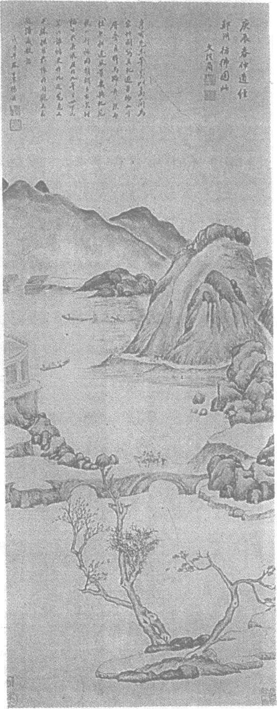 | 释义 | 文从简郑州景物图轴明。文从简绘。纸本水墨。纵98.2厘米,横38.2厘米。北京故宫博物院藏。文从简(公元1574—1648年),字彦可,号枕烟老人,江苏苏州人。文徵明曾孙,文嘉孙,文元善长子。得家传,工画山水、花鸟,兼善书法。山水学王蒙、倪瓒,喜用枯笔皴斫,笔墨工细苍简,清润秀逸,构图平实,略具家法而有所变化。此图画郑州城外湖山景致。远山逶迤,冈岭层叠,山头浑圆,山下水波涟漪,石桥横跨,城墙隐现一角。近景坡堤画有三颗小树,枝干挺拔,枝头似刚吐新绿,表现了北方初春的景色。山道及石桥上有游骑和三、五行旅者,形象生动。水上行有舟楫,一船载有马匹和行旅正向古城方向划去,还有的正准备上船,极富生活情趣。笔墨简洁,清淡秀雅。远山墨色浓淡适宜,苍秀湿润。构图平稳工细,坡石颇有质感。右上款署: “庚辰春仲道径郑州仿佛图此。文从简。”下钤<从简之印>、<字彦可>二印。画上还有杨补题记一段,另鉴藏印章诸方。