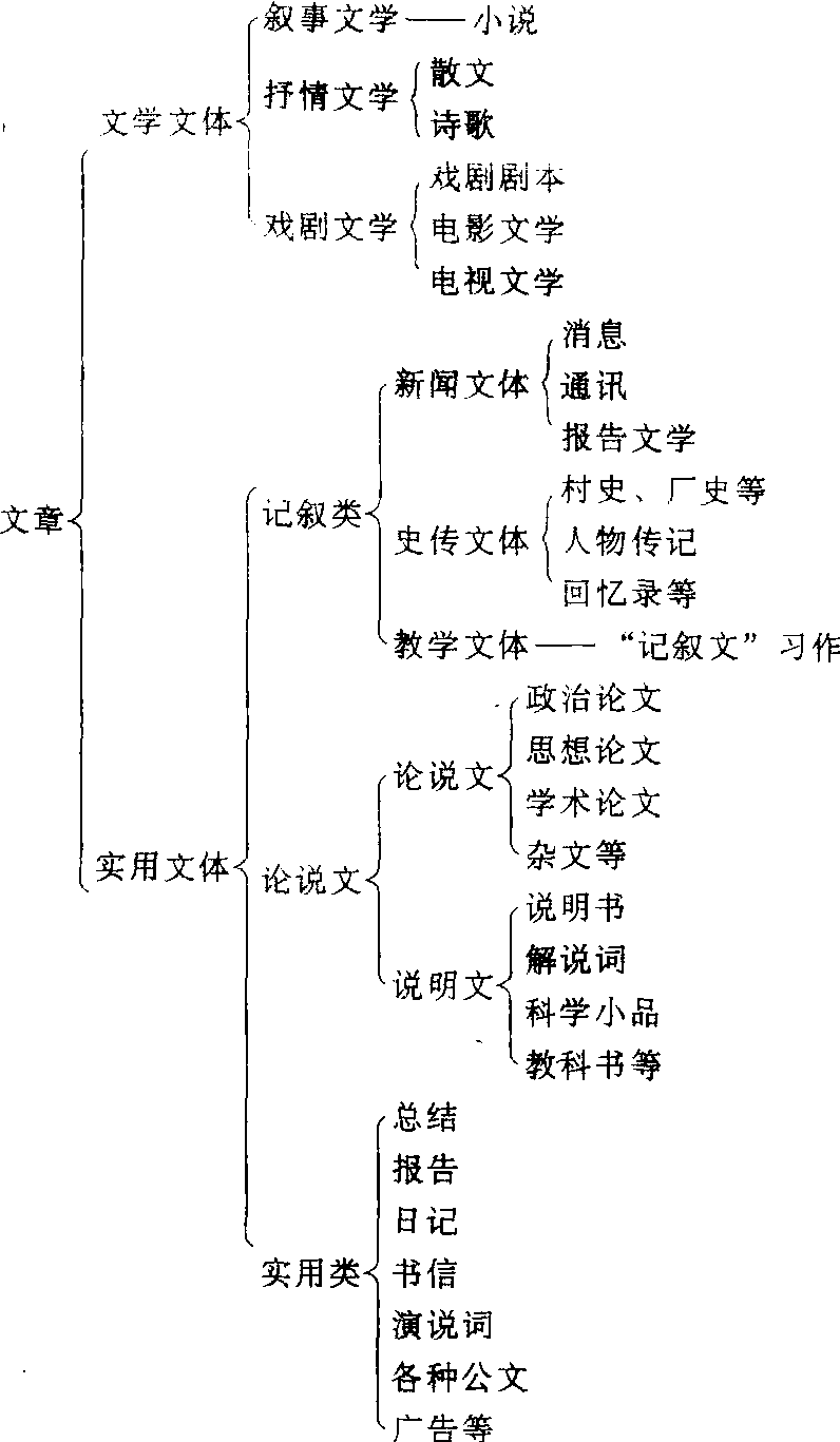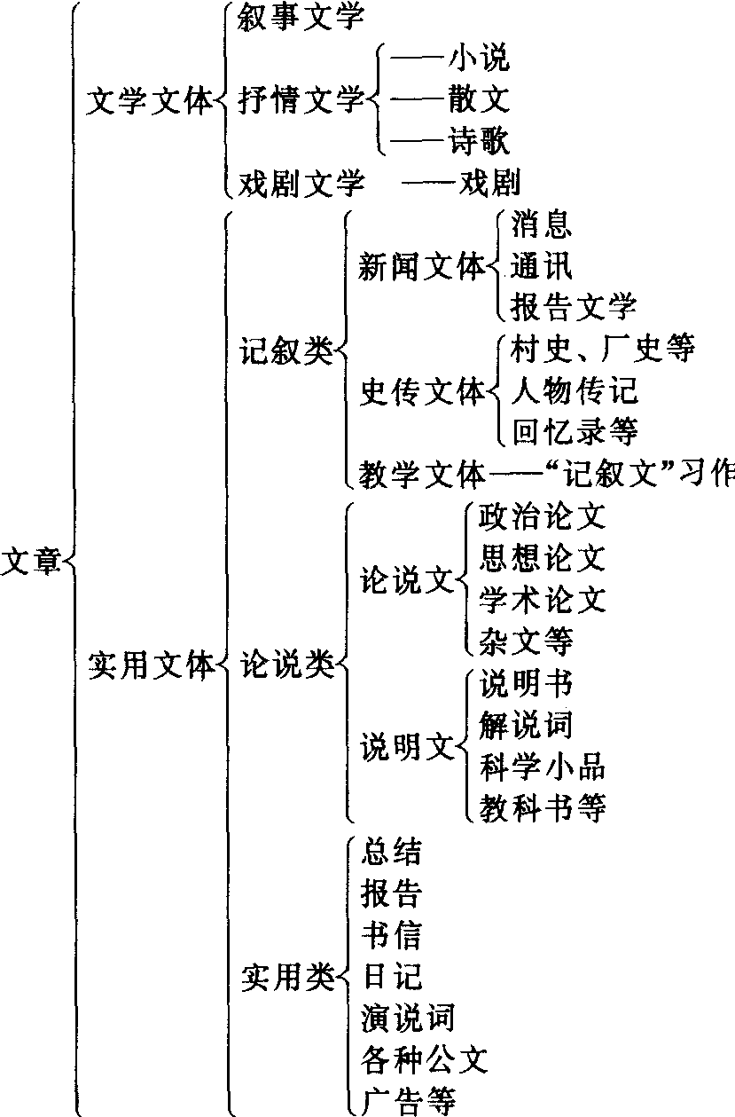 文体Wenti文章的“样式”、“样子”, 它与体裁的意义很相近,但体裁一般专用于文学作品,而文体则泛用于各类文章。在我国,最早给文章分类的,是三国时魏国的曹丕,以后又有刘勰、萧统等人对文体的划分做过研究。但由于文章是随社会的发展而不断变化的,文章的体式也在不断地发生变化,因此至今对文体仍无一个令人满意的划分。现在一般通用的对文体的分类, 可用下面的图概略地表示: