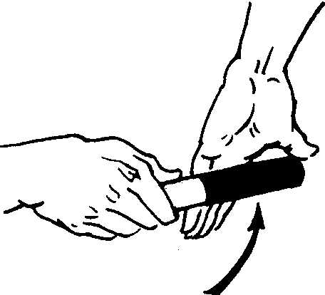 动作要领 ❶接棒人手臂向后下方自然伸出并保持稳定,掌心向后下,虎口张开朝前下方。 ❷传棒人伸臂将棒由下向上挑入接棒人手中。 教学重点 参见下压式传接棒。 |