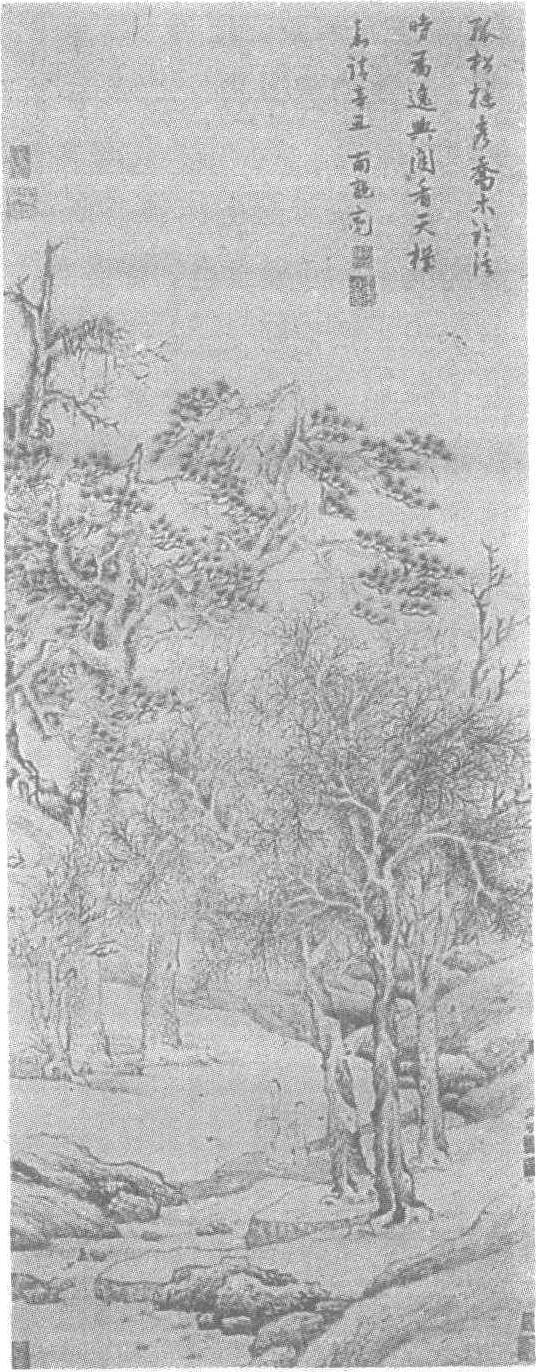 | 释义 | 文徵明临溪幽赏图轴明。文徵明(见《文徵明高人名园图轴》条目)绘。纸本墨笔。纵127.3厘米,横50厘米。北京故宫博物院藏。此图描绘的是文人高士在大自然优美的环境中吟诗赏景的情景。反映文人日常生活是文徵明绘画的一个主要题材。山坡上松柏、杂树高高耸立,枝叶繁茂,针叶如网。山坡旁,树荫下是一条蜿蜒的小溪,溪水湍急,似淙淙作响。溪水上横卧一小桥,桥上站立一文士,目视前方,双手持一诗稿临溪觅句,面对美景,一边欣赏一边反复斟酌。身后有一童子双手捧砚侍立。此图意境清幽深邃,表现了文人宁静、安逸的生活和理想情怀。用笔细致工谨,设色淡雅。笔墨浓淡、疏密得当,恰到好处。左下方款“徵明”。下钤<文徵明印>、<吾言室印>印二方。右上方钱谅题诗“孤松挺秀,乔木临溪,时为逸兴,闲看天机。嘉靖辛丑南郭亮。”
